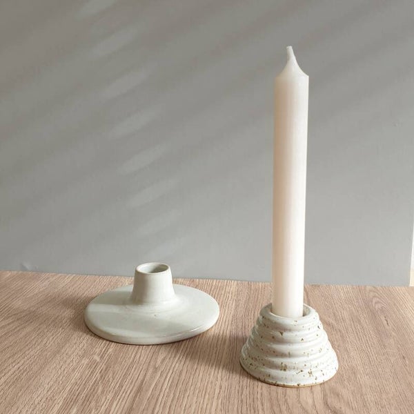 Kleine geribbelde kandelaar, gedraaid van gesikkelde klei, geglazuurd met een wit glanzend glazuur.